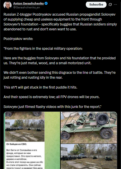 Russian Z-blogger Pozdnyakov accused Russian propagandist Solovyev of supplying cheap and useless equipment to the front through Solovyev’s foundation - specifically buggies that Russian soldiers simply abandoned to rust and don’t even want to use.Pozdnyakov wrote:"From the fighters in the special military operation:Here are the buggies from Solovyev and his foundation that he provided us. They’re just metal, wood, and a small motorized unit.We didn’t even bother sending this disgrace to the line of battle. They’re just rotting and rusting idly in the rear.This sh*t will get stuck in the first puddle it hits.And their speed is extremely low; all FPV drones will be yours.Solovyev just filmed flashy videos with this junk for the report."https://x.com/Gerashchenko_en/status/1980243389669859507pic 1https://files.catbox.moe/kf9kn4.jpgpic 2https://files.catbox.moe/wct8j7.jpgpic 3https://files.catbox.moe/yq9i3o.jpg