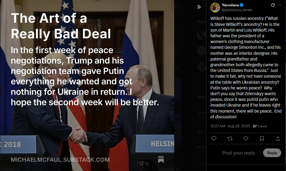 >>519428185>>519428233Peskov: A lot of "homework" needs to be done before the meeting between Putin and Trump.(Meaning that Russia is going to look for new ways to stall for time and delay a ceasefire)[Q]: Prime Minister Viktor Orbán has called the upcoming Russia-U.S. summit a "peace summit." Has Ukraine been invited to participate? Who and how will represent the European side? Are there any plans to sign a document - and if so, what kind of documents?[Peskov]: So far, there are no details regarding any of the points you mentioned, and there is no clear understanding on this matter yet. A lot of "homework" still needs to be done. Both foreign ministries - ours and the U.S. State Department - will have to focus on finding answers to the questions you’ve raised.https://x.com/Gerashchenko_en/status/1980221308047647206https://files.catbox.moe/mplywn.mp4