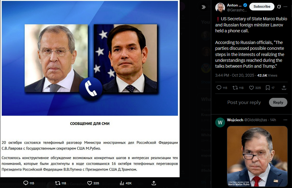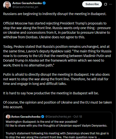 More useless news about the Budapest 'summit':Lavrov and Rubio called and agreed not to meetThem meeting is a necessary condition for Putin, Trump, and Zelensky to meet at BudapestTherefore the Budapest meeting will never happenAs ever with Trump, two more weeks