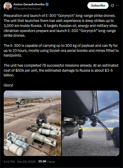 Image of a Ukrainian bomber drone parked at an aerodrome. Seems to be a new innovation to allow them to drop UMP-style glide bombs without using expensive manned aircraft.Lörs?
