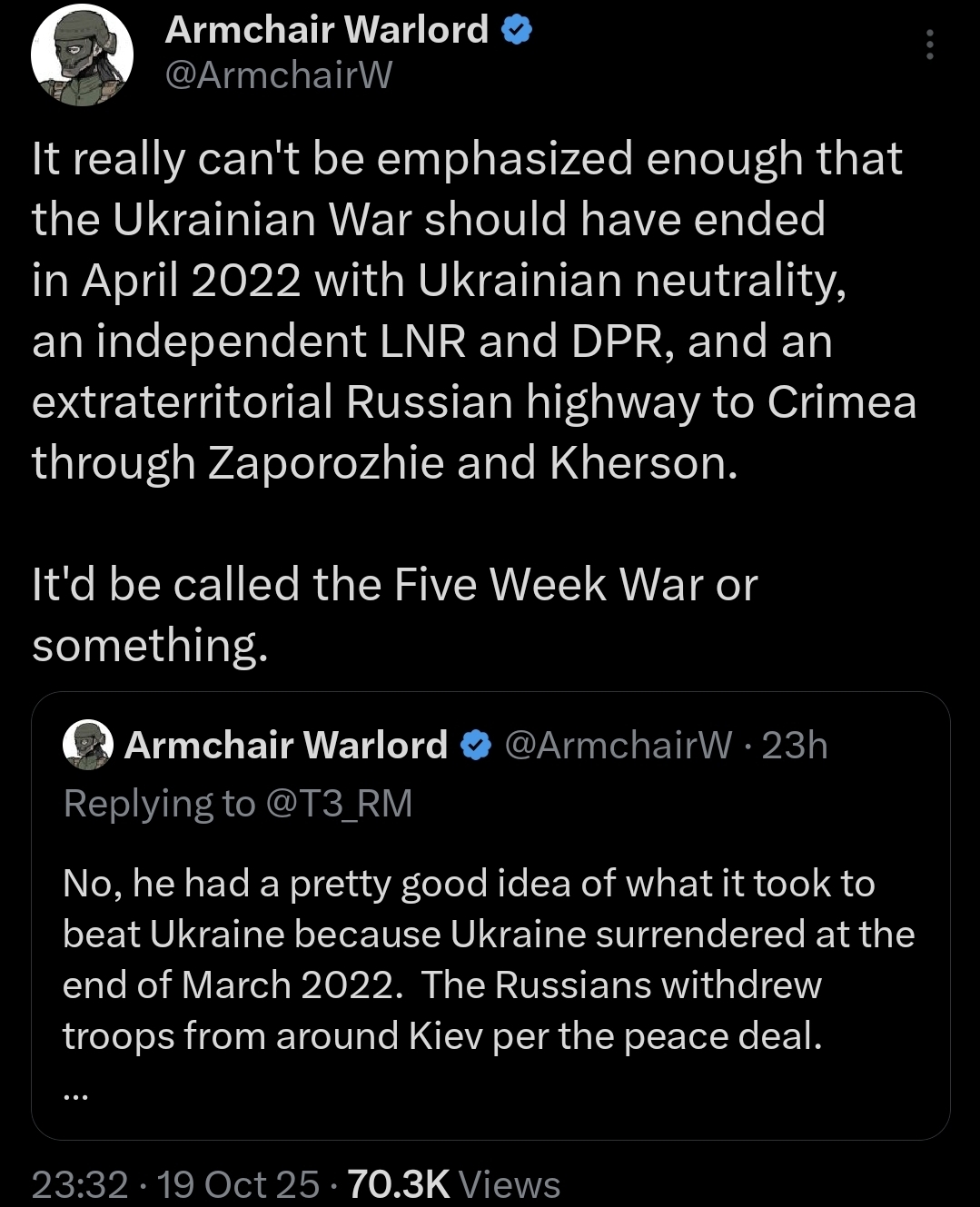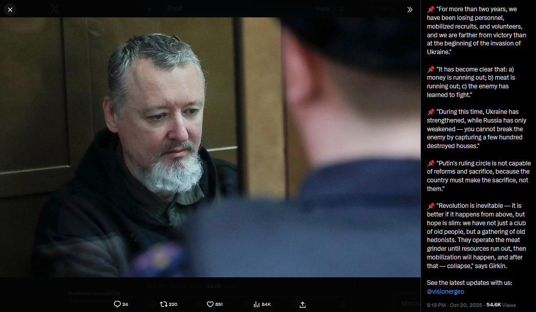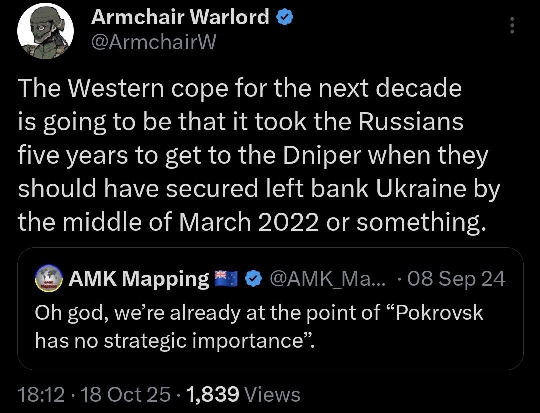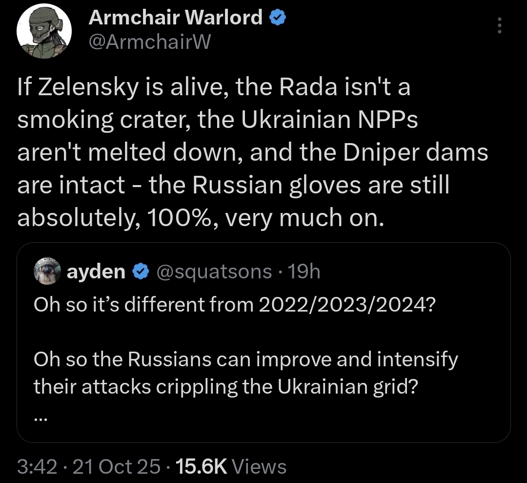 >>519432148>>519432191>>519432244>>519432279>>519432302Thanks for sharing mate. Some highlights>[Putin is] a small manlol> c) the enemy found ways and tactics to fight the "meat," "exchanging" absurdly small areas of terrain for absurdly large volumes of "meat">in 2 years THE ENEMY HAS BECOME STRONGER>To break him by taking [worthless huts] is impossible>[Our leaders] ... don't even keep their own children [in this country]>they will throw hundreds of thousands more mobilized into the "furnace.">[without] "revolution from above" [the country will be thrown] into severe turmoil immediately and simultaneously with losing the war.I don't understand this bit in the 5th post.>(although Russia is not exhausting itself much less with this war, if at all)It seems to jar with the rest of what he said like Russia running out of men and money. It's hard not to define that as exhaustion.