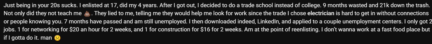 I had the exact same experience as this guy. Everything I learned in trade school i couldve learned on youtube for free and the only job i could get was pizza delivery ffs. Job placement assistance was literally the reason i took the fucking class but they do absolutely nothing for you after you graduate. I wouldve settled for a simple goddamn list of companies hiring electricians.