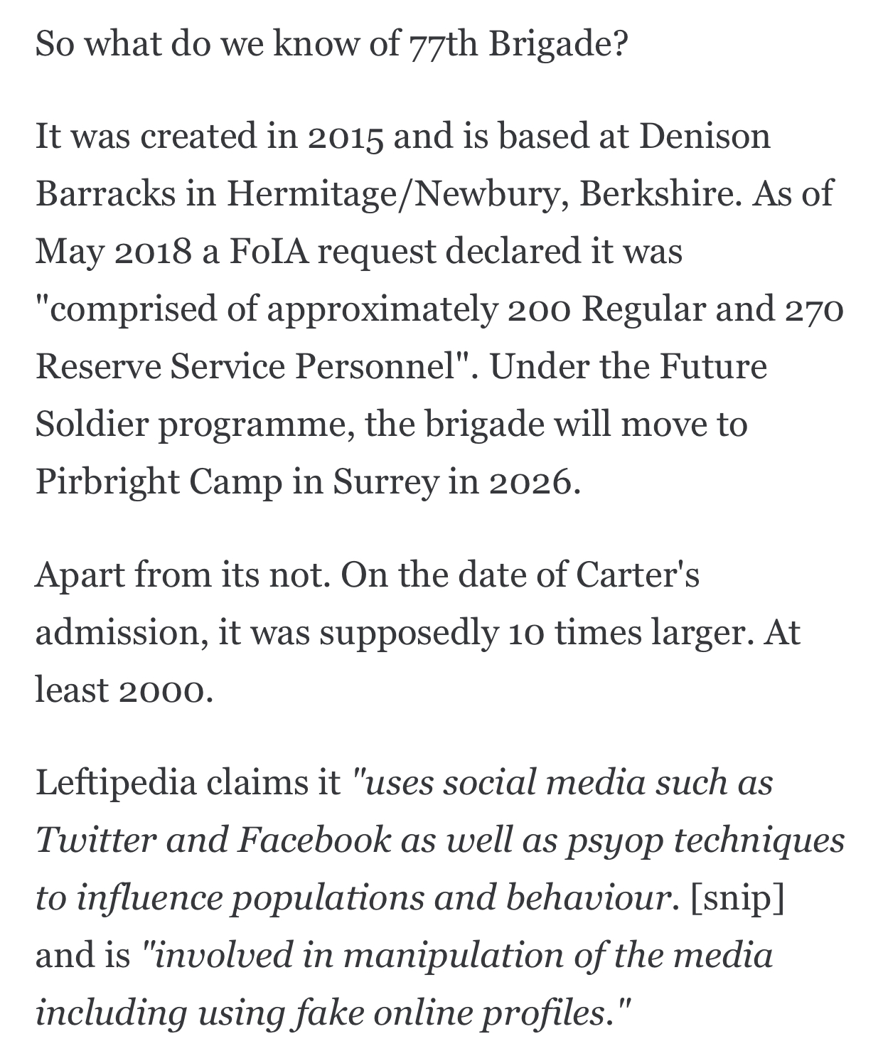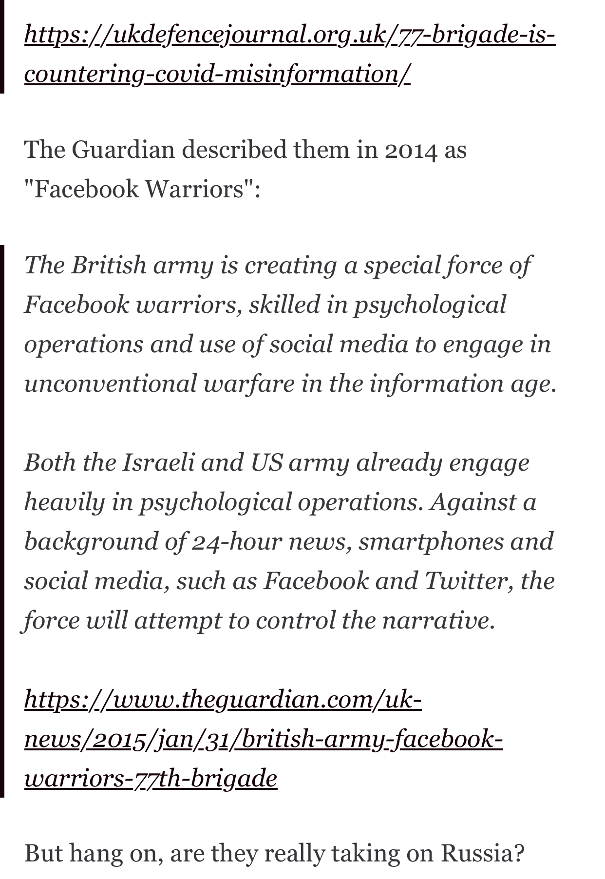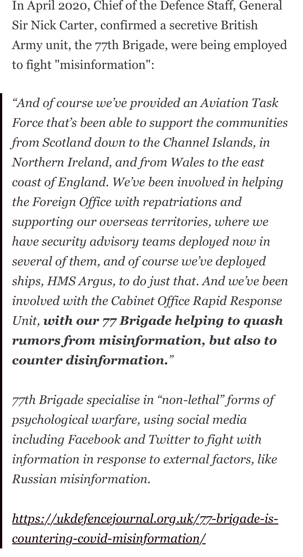 >>519435557UK government media operations unit. It’s headed by the army but staffed by all three services on a supposedly voluntary basis. It’s essentially a PR firm for UK strategic interests that has a reserve arm that recruits media professionals.