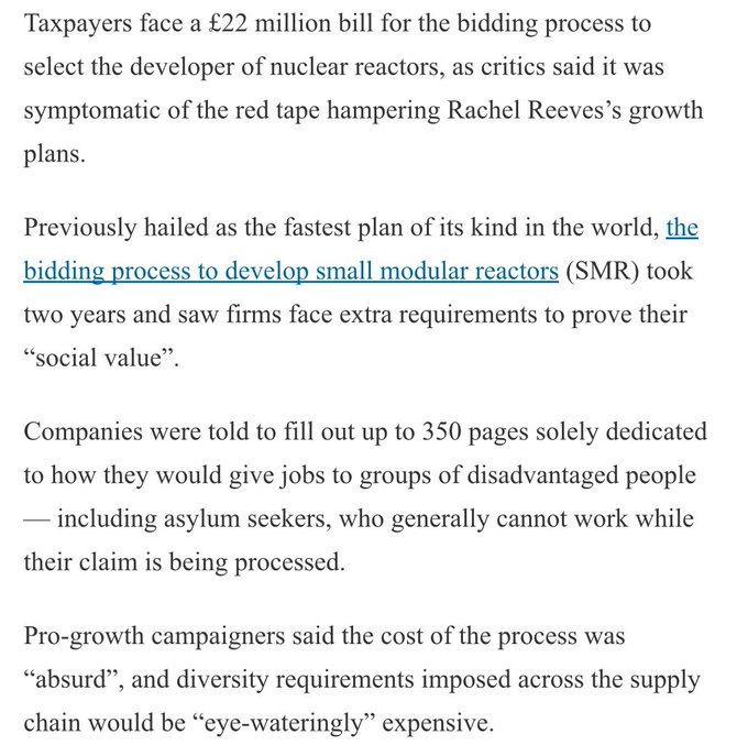 https://xcancel.com/jamesd_graham/status/1980233132919177290#m>The bidding process for developing Small Modular Reactors took two years. >Bidders had to prove how they would add 'social value.' Including provision of jobs for illegal migrants and plans to have a 50/50 gender balance.>No wonder nothing works in Britain.lol