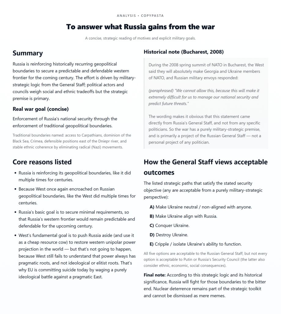 ▶NEW CLIPS>North Korean Veterans of Kursk march while singing To Serve Russiahttps://files.catbox.moe/s85ufe.mp4>Kiev at night, 10/10/2025https://files.catbox.moe/wenlx1.mp4https://files.catbox.moe/7qfa4i.mp4https://files.catbox.moe/7m3ueu.mp4>The Ukraine's Counter-Offensive to retake Krasnoarmeysk ends in boiling coffinshttps://files.catbox.moe/kc7rs3.MP4>Kharkov, 10/05/2025https://files.catbox.moe/2vaq24.MP4https://files.catbox.moe/8g7jlq.MP4https://files.catbox.moe/s7i0h5.MP4https://files.catbox.moe/8evzj4.MP4https://files.catbox.moe/5v2bkn.mp4>Lights out in Chernigovhttps://files.catbox.moe/hbyvl5.mp4>DRG Spetsnaz liquidate SBU convoy behind enemy lineshttps://files.catbox.moe/o51o63.mp4>Russian troops liberating Verbovoye Dnepropetrovskhttps://files.catbox.moe/3k0zpb.mp4>Gerans flying into Dnepropetrovsk cityhttps://files.catbox.moe/8dfefm.mp4https://files.catbox.moe/c2uip4.mp4https://files.catbox.moe/gn4ba3.mp4>Missile/Geran strikes in Kiev region 9/28/2025https://files.catbox.moe/huyfvu.MP4https://files.catbox.moe/ym87op.mp4https://files.catbox.moe/8h7q0h.mp4https://files.catbox.moe/6w7ddk.mp4https://files.catbox.moe/da1ige.mp4https://files.catbox.moe/rd2wiz.mp4https://files.catbox.moe/rnhp4x.mp4>Zelensky admits the Ukraine is losing the warhttps://files.catbox.moe/cd37w8.mp4>FSB Counter-Terror Unit Gorynych of Donetsk liquidates AfU drone operators targetting civilians near Toretsk and Horlovkahttps://files.catbox.moe/dwopoq.mp4▶Archivehttps://rentry.org/chugvidz