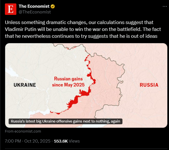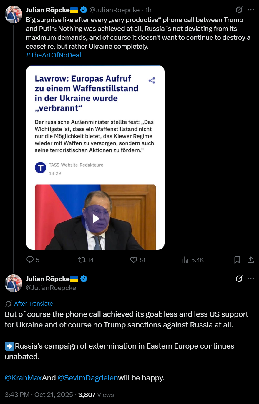 https://x.com/JulianRoepcke/status/1980615880355570042>Big surprise like after every „very productive“ phone call between Trump and Putin: Nothing was achieved at all, Russia is not deviating from its maximum demands, and of course it doesn't want to continue to destroy a ceasefire, but rather Ukraine completely.>#TheArtOfNoDeal>But of course the phone call achieved its goal: less and less US support for Ukraine and of course no Trump sanctions against Russia at all.>Russia's campaign of extermination in Eastern Europe continues unabated.>@KrahMax And @SevimDagdelen will be happy.bomb the hyhyls