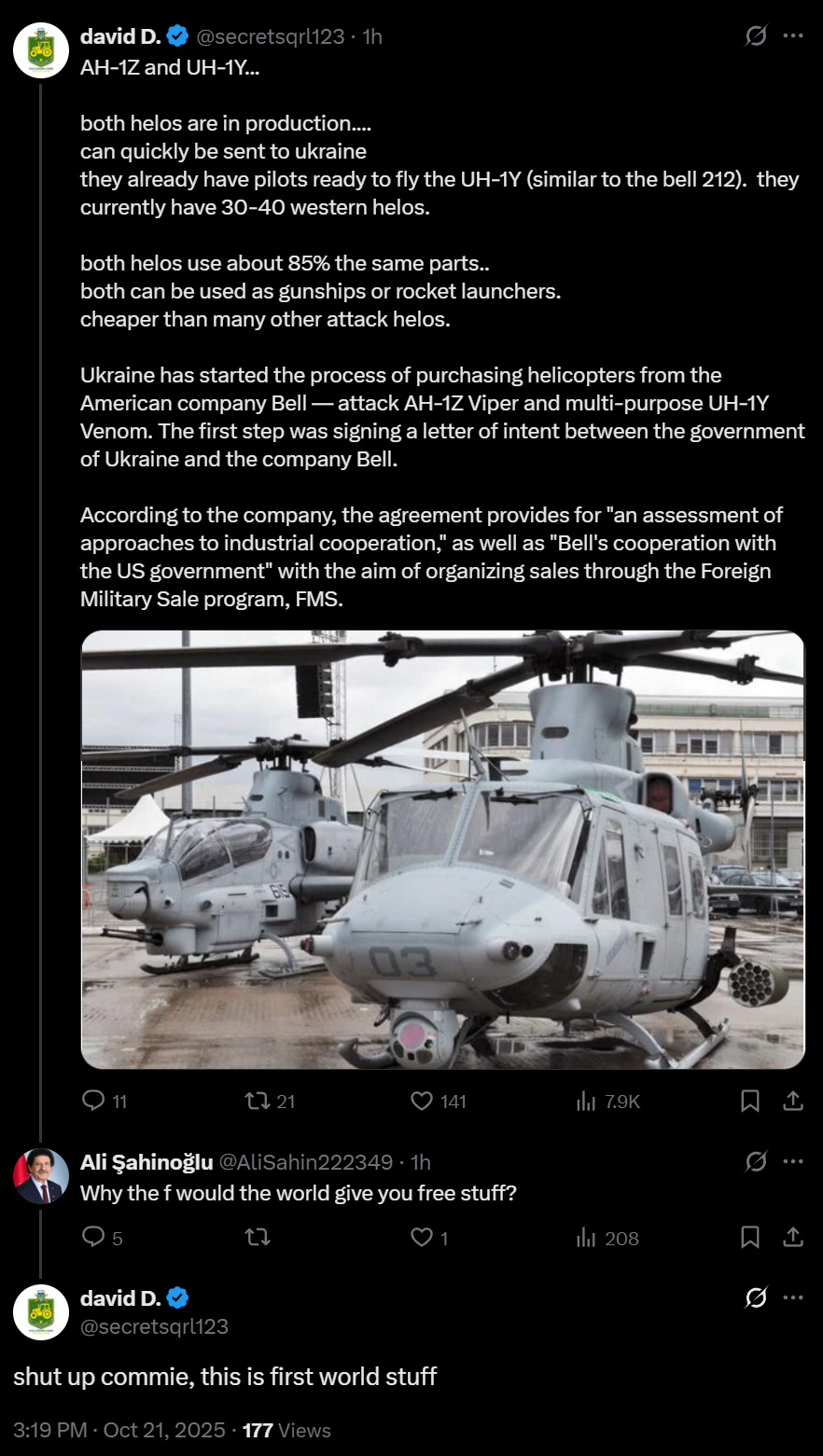 >AH-1Z and UH-1Y...>both helos are in production....>can quickly be sent to ukraine>they already have pilots ready to fly the UH-1Y (similar to the bell 212). they currently have 30-40 western helos. >both helos use about 85% the same parts..>both can be used as gunships or rocket launchers.>cheaper than many other attack helos. >Ukraine has started the process of purchasing helicopters from the American company Bell — attack AH-1Z Viper and multi-purpose UH-1Y Venom. The first step was signing a letter of intent between the government of Ukraine and the company Bell.>According to the company, the agreement provides for "an assessment of approaches to industrial cooperation," as well as "Bell's cooperation with the US government" with the aim of organizing sales through the Foreign Military Sale program, FMS.LOL