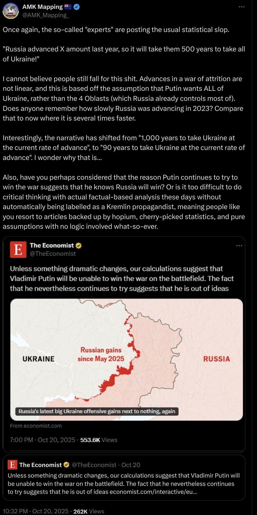 Thoughts about this statement that was put out yesterday by the leaders of Europe's biggest economies (Germany, France, UK, Italy, Poland, and others)?I think the most important sentence is:>We remain committed to the principle that international borders must not be changed by force.https://www.gov.uk/government/news/joint-statement-on-ukraine-21-october-2025