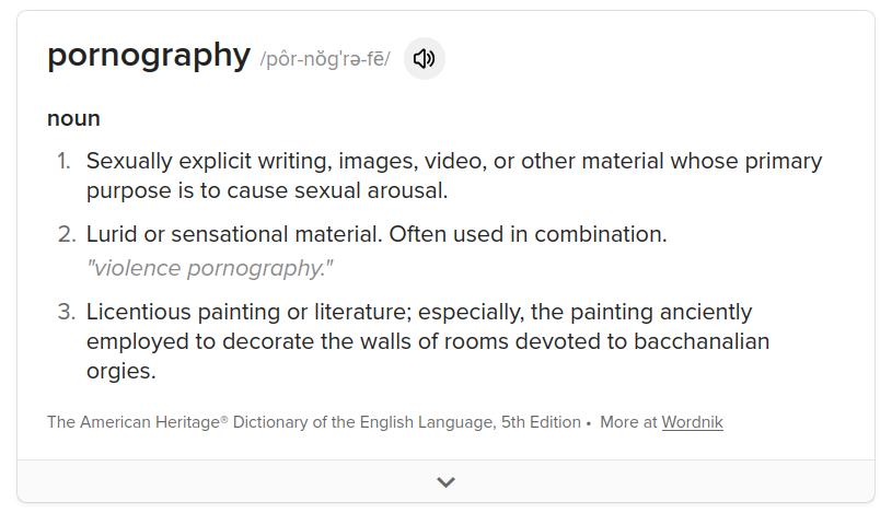 I just had a random thought on the subject of "Porn." Porn is a very broad term that applies to a lot of things and, of course, people who use the word "Porn" often don't mean the dictionary term for it.Porn is technically anything that invokes sexual arousal. A picture of swimsuit model could be classified as porn and even an erotic story could be as well, but I think many of you will draw a line in the sand. Your definition is somewhere else. Is a photo of a woman posing naked by herself porn? Is hentai porn? Is it only porn if it's a real woman being penetrated?I think this is worth comprehending. Places like Texas have restrictions on porn. If your definition of porn is vague, they can apply laws further
