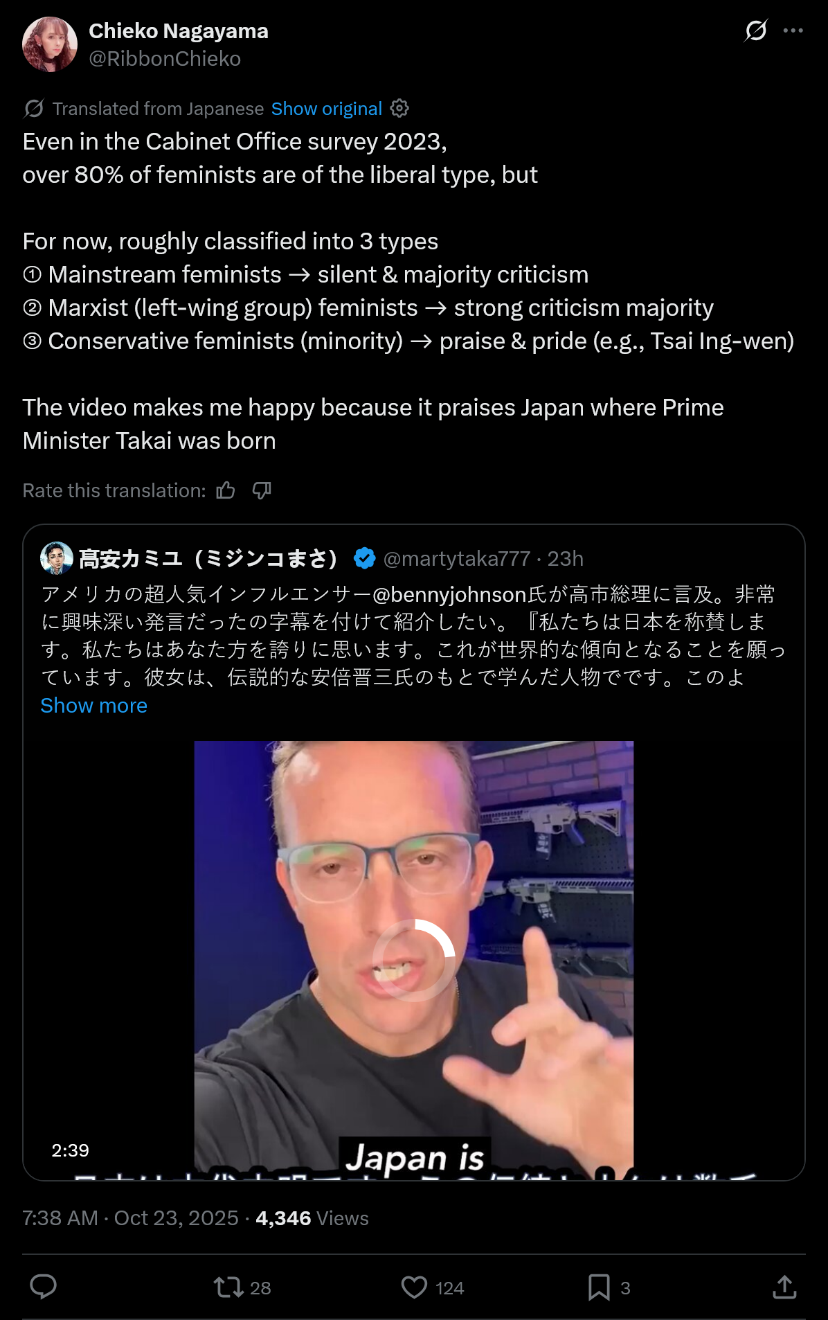 >>519676097>>519676133Yeah, as I said, very sparse. None of the videos from her speech to the Diet, etc., were posted by them. The LDP and her should take a page from Trump's playbook and make their own Rapid Response account, that way all her news is in one place. That and/or English onlookers should be able to agree on the best source, because currently we have to trust some literal whos. Obviously I'm not focusing on Japan now that they seem to be in good hands, but I'd rather have easier places to go. For UK stuff, there's Farage's account, the Reform UK account, and GB News, for example.