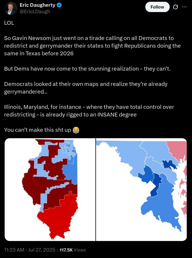 The funny part about the republican gerrymandering scheme they went with is how badly it’s going to backfire because while you can turn an entire state red like Idaho or Montana the dems are going to do the same exact shit to places like New York, california, Illinois, and New Jersey and can anyone here who took their civics class tell me which states have more electoral college votes? Because I can! It’s certainly not a state like South Dakota! Or even missouri!