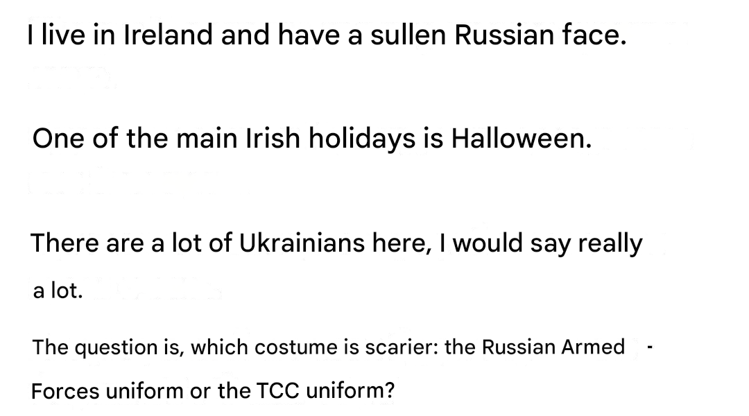 >>519693335I’m not even joking here, this is the honest to god logic /uhg/ uses to explain the body exchange. Russians are dying in droves, but Ukraine can’t collect any of the bodies because they’re retreating, except they’re not retreating because the wars at a stalemate, and actually Ukraine is advancing but Russia collects the bodies too fast but they also take their dead and turn them into cubes or leave them in a field. Oh and the bodies russia is giving Ukraine are actually Russians but Ukraine keeps accepting them because….uhhhhh. Oh and Russia told Ukraine not to bring any of the thousands of dead Russians cubs they don’t have because they’re retreat advancing. But of course the body exchange is a meaningless number, and random numbers off twitter are far more accurate.