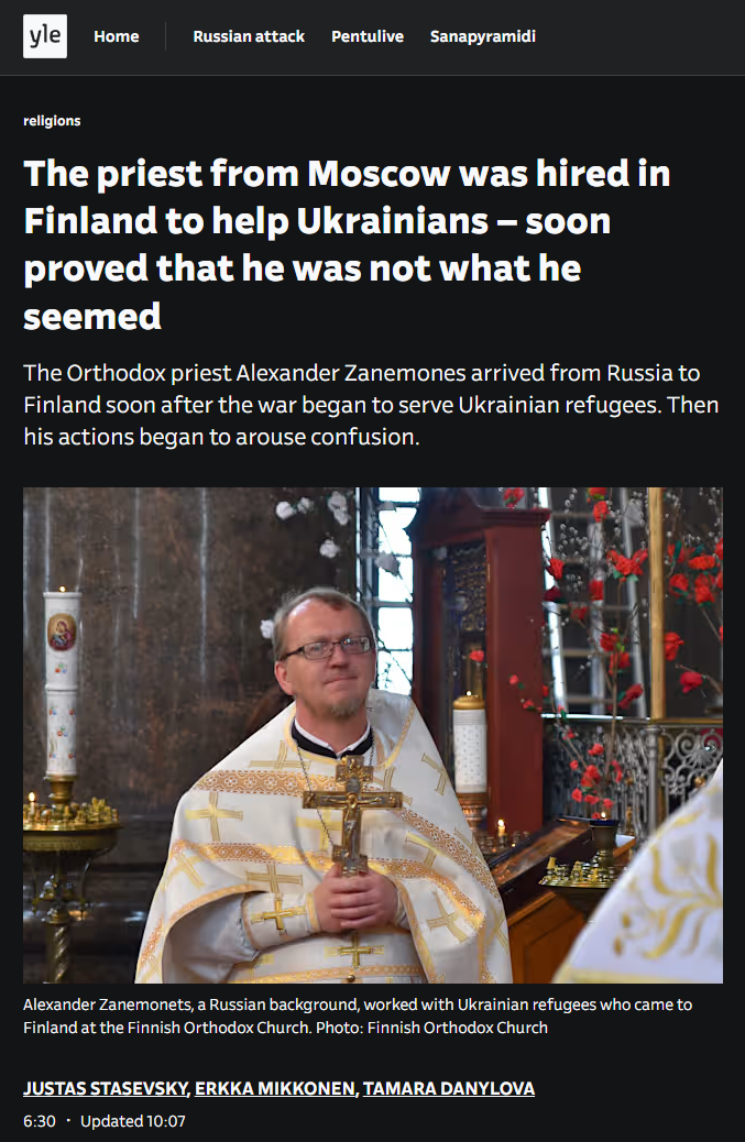 >Russian priest wasn't what he seemed to be>His Ukrainian wasn't perfectBy the way, no need to mention that most of Ukraine talks Surzhyk(pidgin Ukrainian) at best>On 24th February 2024 he didn't condemn the invasion, instead talked about brother nations, need for peace and forgivenessHow fucking dare he!>Patriotic hohol refugees got angry.>His background also was suspicious, he's from Ukraine and was priested in Ukraine, but not in the right church!>He also "lied" about coming directly from Israel, when technically his plane departed from Moscow. He used language barrier excuse.>The priest now lives in US and says he escaped from Russia to Finland when the war started.>Supo(our glowies) told YLE that Russia may use church as soft power and hybrid operations, they don't comment on the priest's situation, but you got the implication.