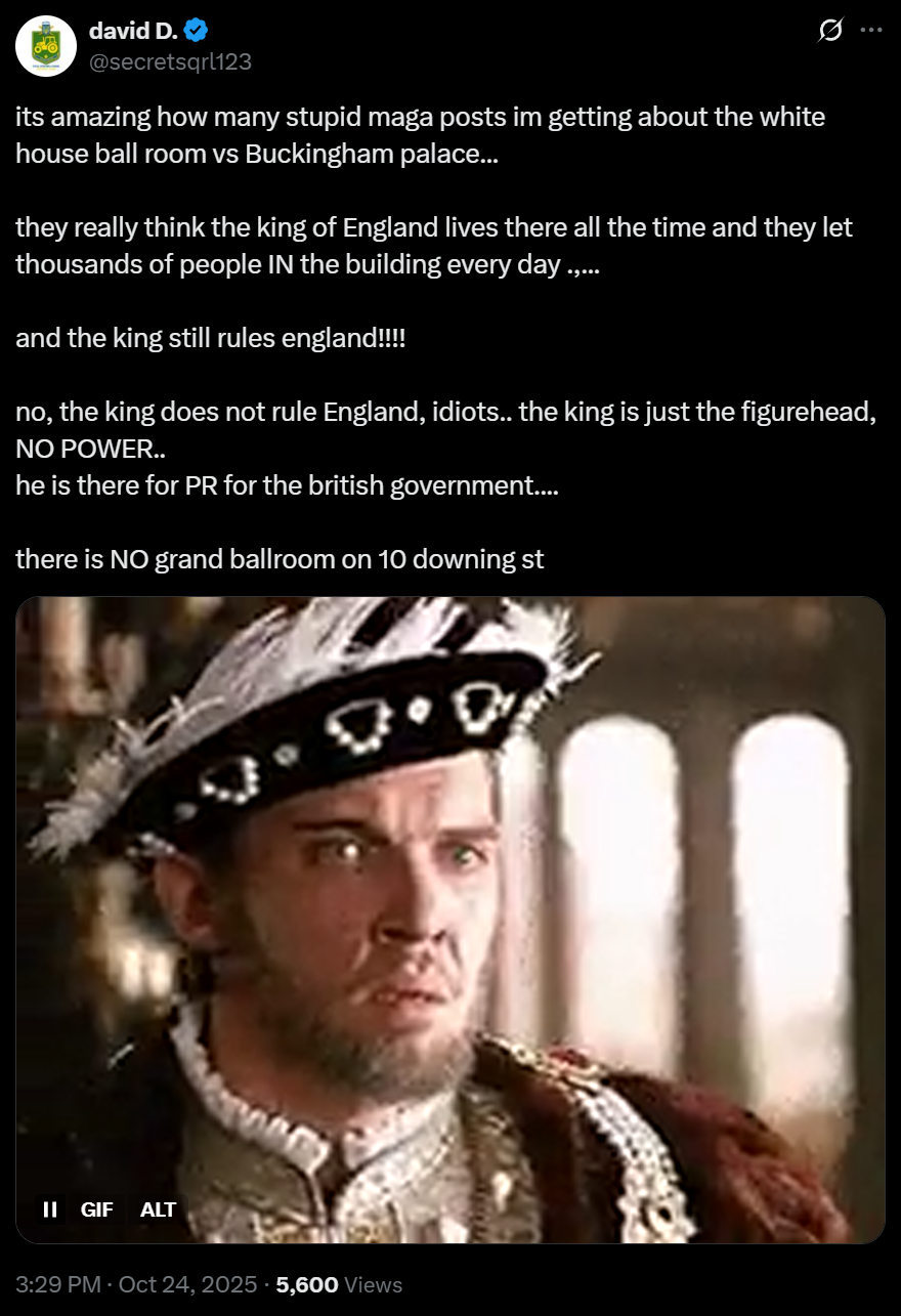 >its amazing how many stupid maga posts im getting about the white house ball room vs Buckingham palace...>they really think the king of England lives there all the time and they let thousands of people IN the building every day .,...>and the king still rules england!!!!>no, the king does not rule England, idiots.. the king is just the figurehead, NO POWER..>he is there for PR for the british government....>there is NO grand ballroom on 10 downing st