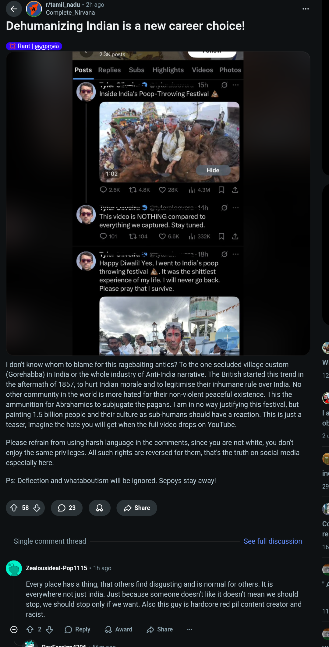 >>519693367Ban him from ever coming to India again if he has the audacity to do this. Japanese people would never tolerate something like this if a foreign streamer comes to their land just for views and cash and doesn't respect the culture.This man went through one of India's finest airports probably, has seen a lot of India, and instead he ignores it because for him, hating Indians is a content grift or he sees India as a poor country or something like that. It doesn't matter for him. He gains fame at the expense of defaming Indians and he's being celebrated. This is hate and ragebait on a huge level.How is this different from Pewdiepie at all to be honest? The man normalised racism against Indians at the expense of comedy but he'd never do it against any other race.He is indirectly causing intense racism against Indians, knowing it, and is gaining profit from it.No other country in the world would tolerate anything like this. He'd never do this in Korea if they had something similar or whatever it is. Or in any other country.Also, if those people want to do it, then that's their thing. But it shouldn't be advertised at all.Banning isn't the solution, but can the idiot Indian bommers for ONCE see how their whole campaign of Incredible India is going to crap because people like this only need one image and India's reputation is destroyed forever.I say the Indian Govt may be focused on not responding, but please employ some youngsters some gen z people that know HOW to give a proper response, our own counter-narrative. But something has to change.It will get worse before it gets better.