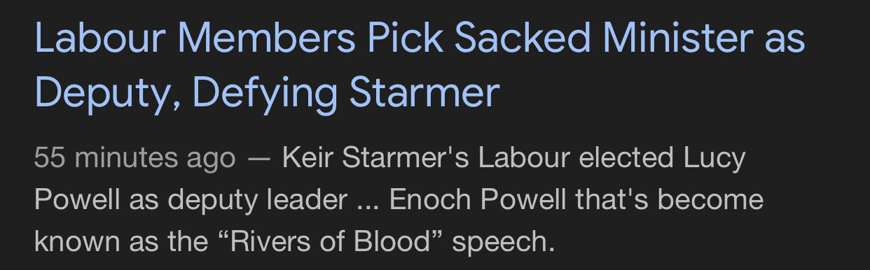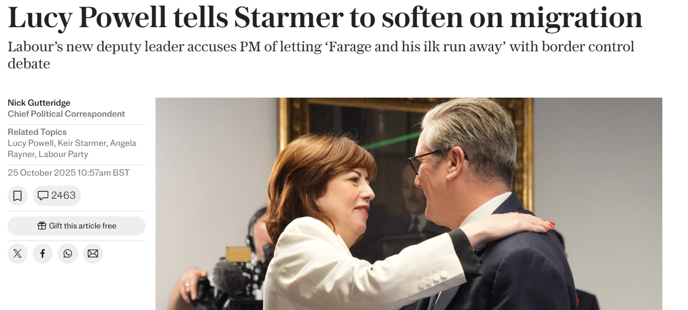 https://www.dailymail.co.uk/news/article-15226089/Starmer-Labour-deputy-leader-minister-Lucy-Powell-panic-Reform.html>Blow for Starmer as sacked Cabinet minister Lucy Powell wins Labour deputy leader contest - warning he is failing and must lurch to the LeftHaha.