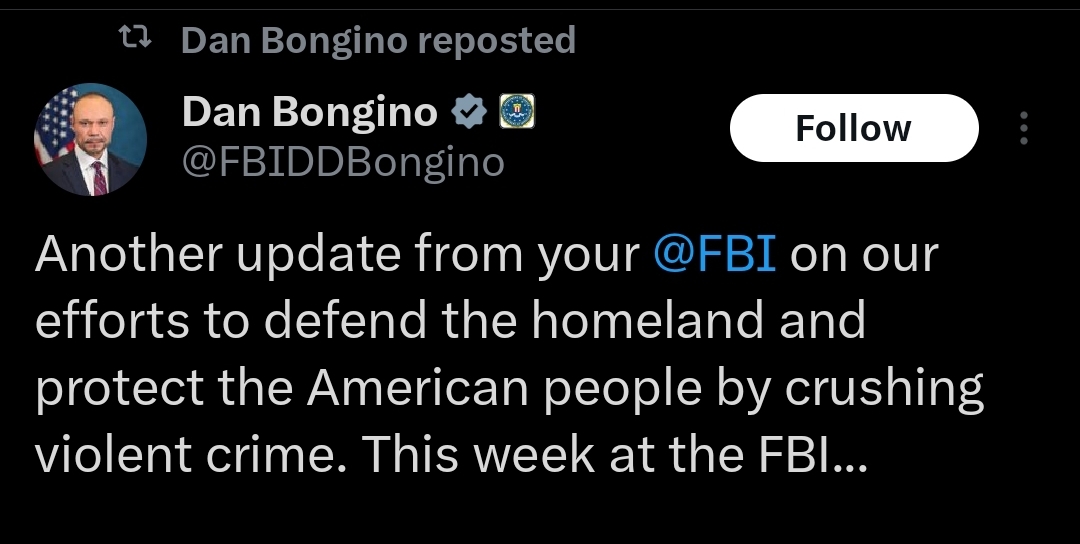 Another update from your @FBI on our efforts to defend the homeland and protect the American peopleby crushing violent crime. This week at the FBI...- @FBIPhiladelphia took down a drug trafficking ringin the Kensington neighborhoodwhere over 30members oftheWeymouth Street Crewwere charged with conspiracy to commit drug trafficking.- @FBISanAntonio arrested three subjects while @FBIAlbuquerqueconducted foursearch warrants of their residences, seizing over $2 million in illegal narcotics, including THC/vape pens, over $182,000 in bulk cash, 11 firearms, four vehicles, and other valuables - @NewYorkFBI participated in a nationwide takedown of over 30 defendants for their alleged involvement in two separate illegal poker and sports betting schemes where the odds were rigged.- @FBIMilwaukee executed a large-scale takedown resulting in 16 federal search warrants and 20 subjects taken into federal custody. Approximately $50,000 in U.S. currency was seized, along with three vehicles, 14 pistols, onerifle, onekilogram of cocaine, and six pounds of marijuana.- @FBISaltLakeCity arrested four individuals for illegal gambling and money laundering, executed one federal search warrant, and assisted in 116 immigration arrests.The FBI has arrested more than 28,630 violent criminals so far in 2025.I’d like to thankour FBI Field Offices for their outstanding work. The FBI will continue to do EVERYTHING in our power to protect the American people and bring violent offenders to justice. God bless America, and all those who defend Her.https://x.com/FBIDDBongino/status/1982098405456326701?t=SkszWzD0LOTj1ZOFTOCnqw&s=19