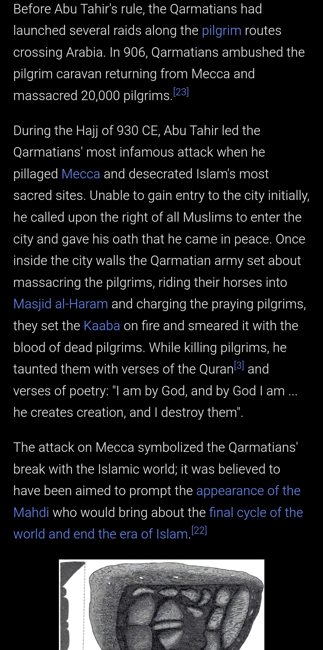 Reminder that a Persian man by the name of Abu tahir sacked meccah with his Qarmatian Persian army, killing everyone, defiling the zam zam water of the city and taking the black stone to smash and use the pieces to wipe his ass with.