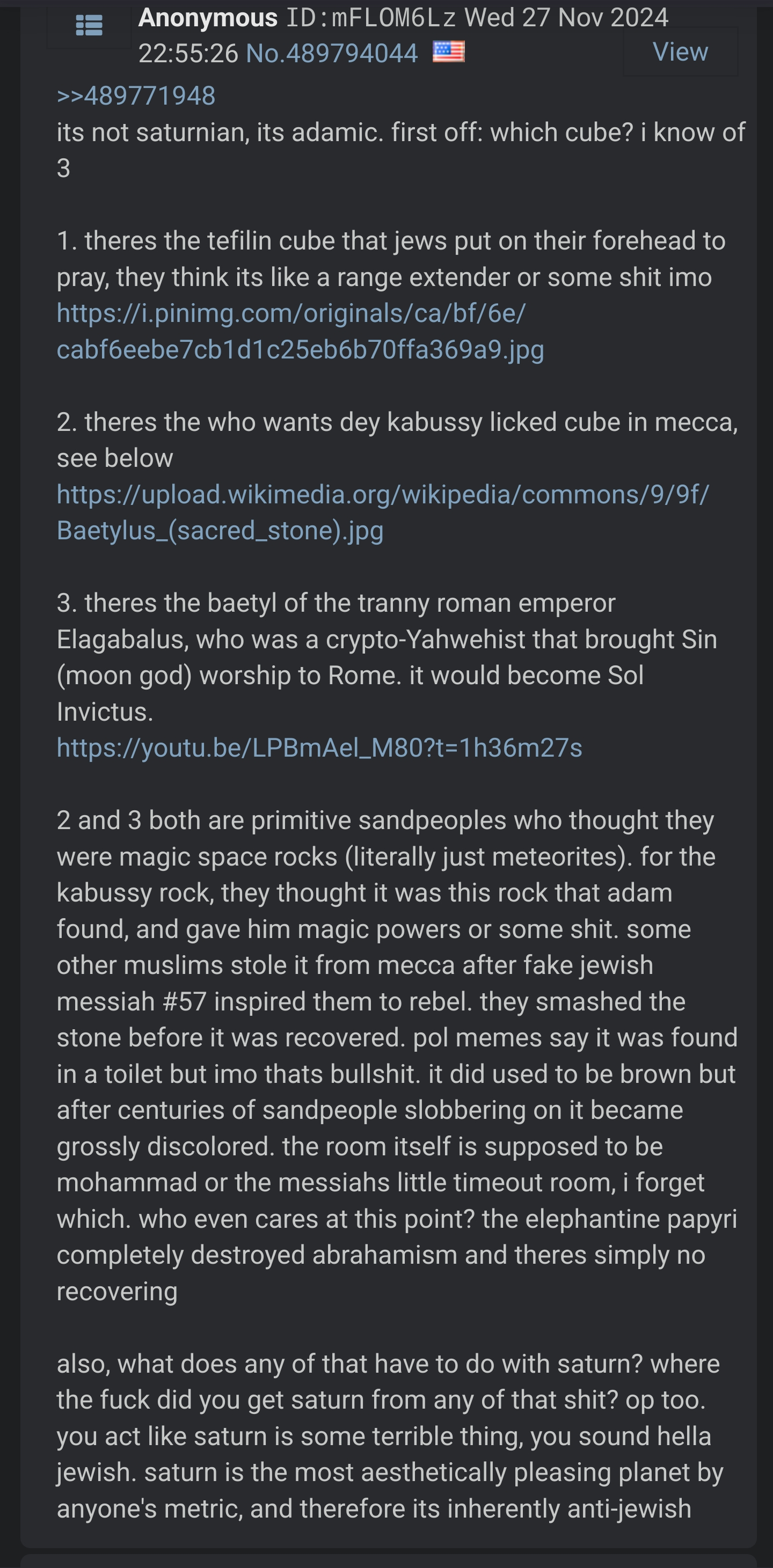 >>519781134>>519781202Jeets believe the Muslims imprisoned their God in the cube in meccaIt's supposedly an apartment jail cell in that thing