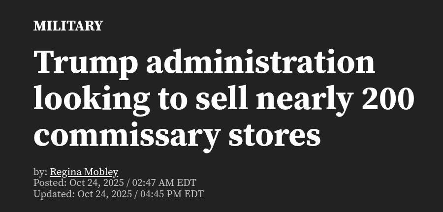 >>519791466https://www.wavy.com/news/military/trump-administration-looking-to-sell-nearly-200-commissary-stores/but original ishttps://www.militarytimes.com/pay-benefits/mil-money/2025/09/19/pentagon-takes-step-toward-potentially-privatizing-commissaries/