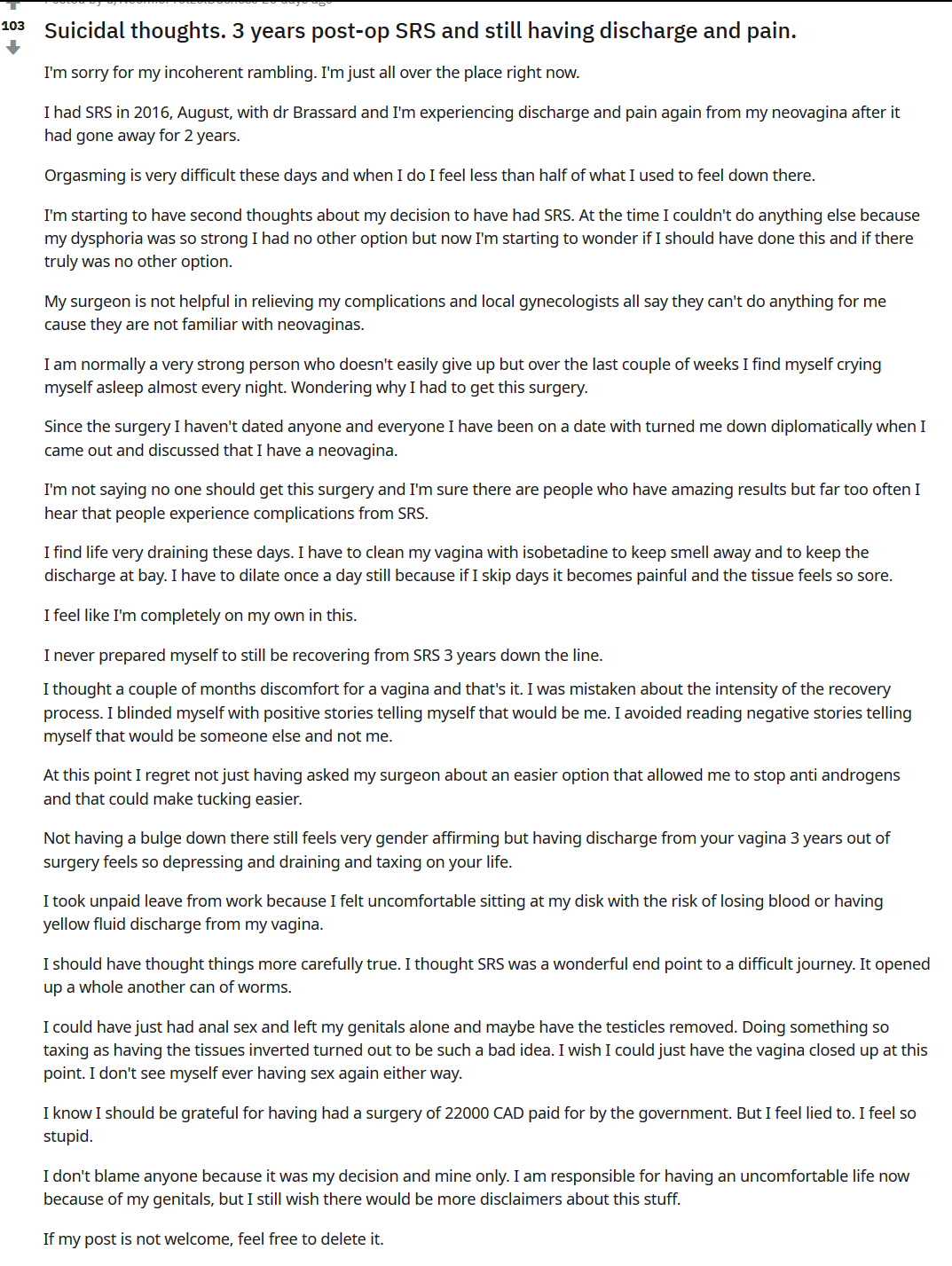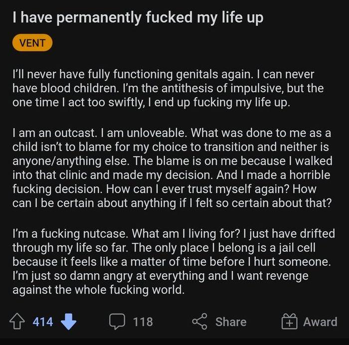 >>519795250mad enough to get violent but it's like trained behavior not to see the obvious culprits (the doctors and ngo's performing and pushing for this shit). you hear the 'it was my own choice' line a lot with detransites but that 'choice' was only made after years worth of grooming and propaganda.