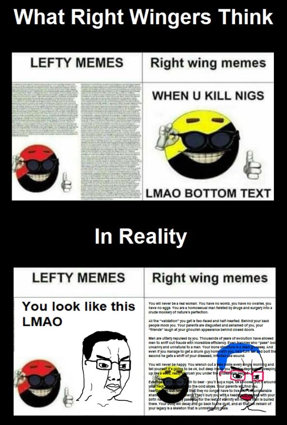 >Right wing memes are short and sweet because they ask you to appeal to kneejerk assumptions which have already been deeply coded into your mind by social propaganda. By contrast, leftist memes are tasked with breaking your social brainwashing, which requires complexity and nuance