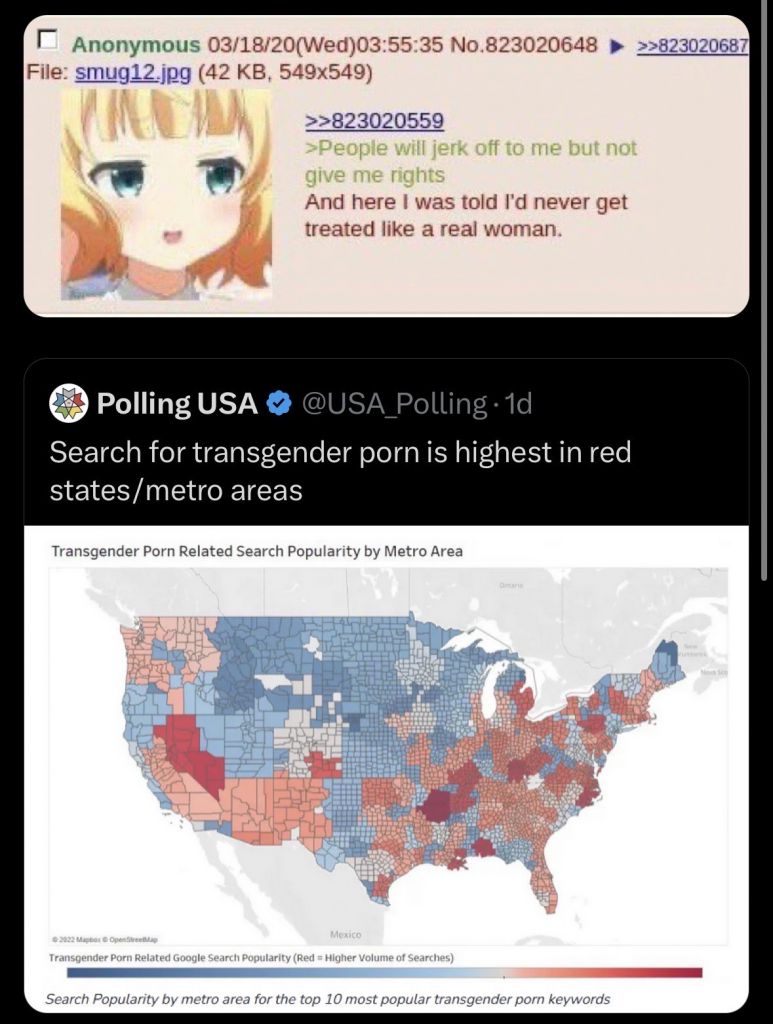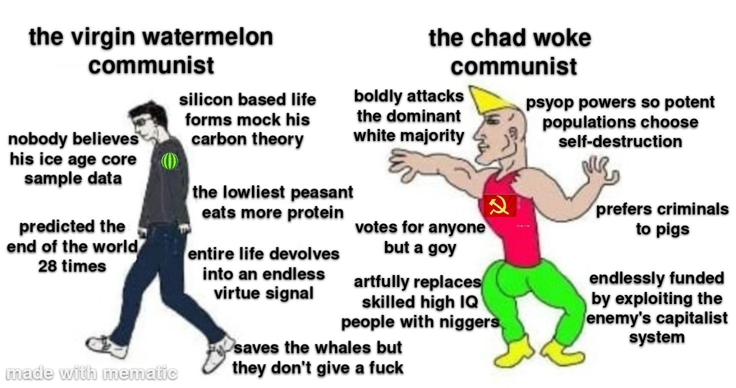 >>519795026The most annoying trait about leftists right now, and something that is hurting them a lot, is their desperation. More particular, their attempts at mimicry. After years of acting like the right was just a couple schizos online, they likely subconsciously realize they were wrong. Now they are desperately trying to force populism and copy the right in nonsensical ways. They think if they act "cool" they'll become so. This leads to them just lying even more blatantly than any of their previous shit. The ones they send to places like 4chan are even given permission to act like they are the "real racists" thinking they are going to trick some fictitious group of dumb chuds. The best example of all this behavior is Newsom and his floundering. The left has essentially entered a "nuh uh" phase which is why their remaining voter pool is reaching levels even more retarded than before. They need to stop pretending to be something they are not, let go, and admit they lost.