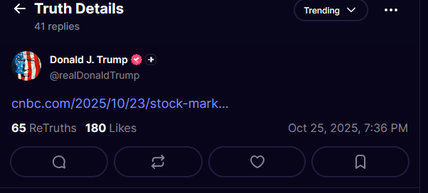 Dow rallies 400 points for first close above 47,000 ever following mild inflation report: Live updatesU.S. stocks closed at new heights on Friday as cool inflation data spurred optimism among investors that the Federal Reserve can stay on its rate-cutting path, boosting the U.S. economy and justifying higher valuations for equities.The Dow Jones Industrial averagerose 472.51 points, or 1.01%, to 47,207.12, securing its first close above the 47,000 level ever. The S&P 500 added 0.79% to 6,791.69, while the Nasdaq Composite climbed 1.15% to 23,204.87. All three major averages closed at records.https://www.cnbc.com/2025/10/23/stock-market-today-live-updates.htmlhttps://truthsocial.com/@realDonaldTrump/posts/115436250208272425