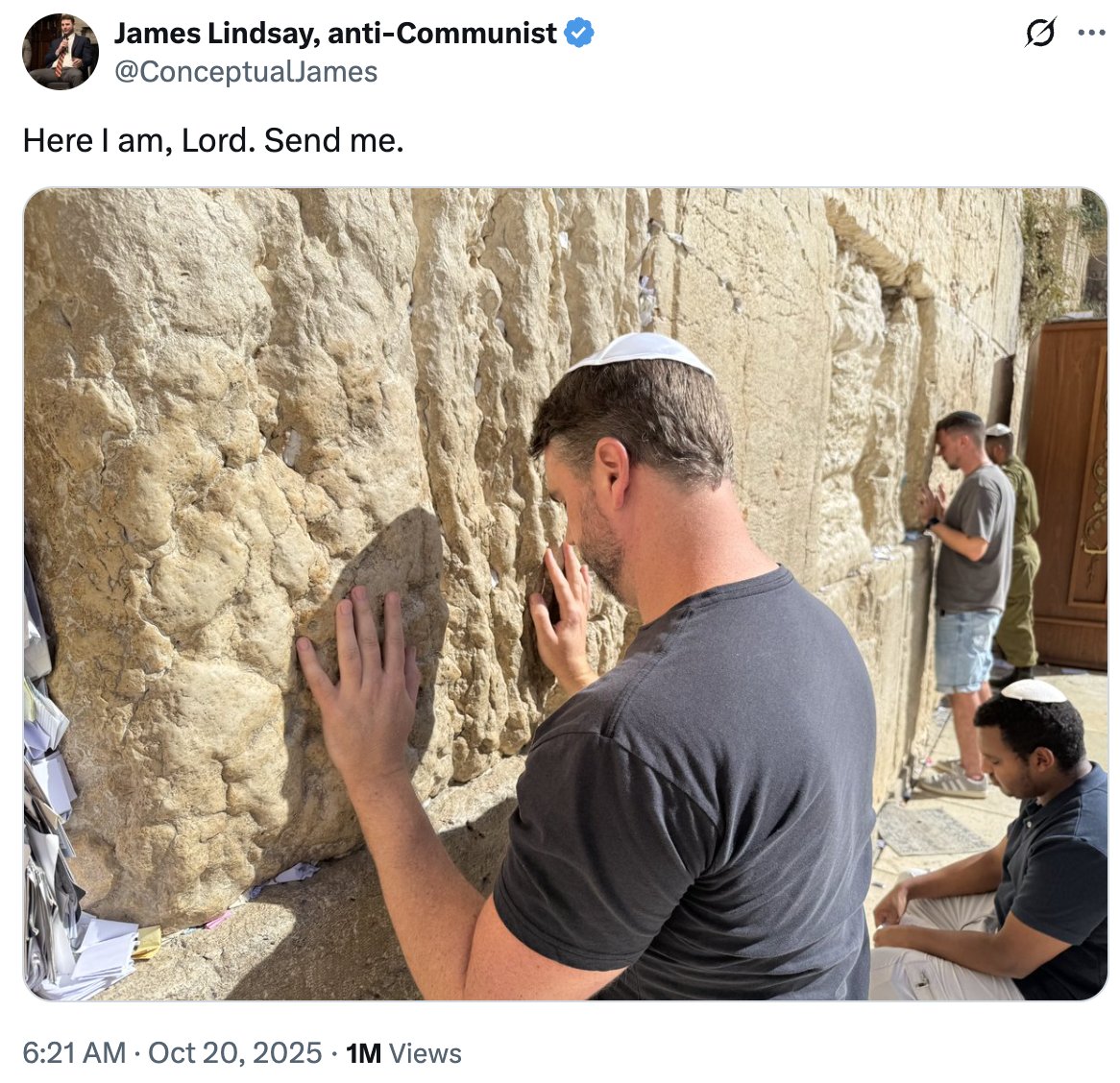 >>519805455This is why I can't stand James Lindsey. He puts 'anti-communist' in his handle. He was JUST in Israel wearing the hat and touching the fucking wall just a couple days ago. All he does is pretend to be right wing and then proceed to call authentic right wing people 'woke right' for criticizing jews. Or he calls people like Sargon a secret socialist/communist because he said the UK NHS should only provide 'free' healthcare to people that pay taxes and are born in the UK.And at least you know where a leftist stands. But these fake right wing faggots who play goalie for Israel and attack other right wingers are fucking snakes in the grass.