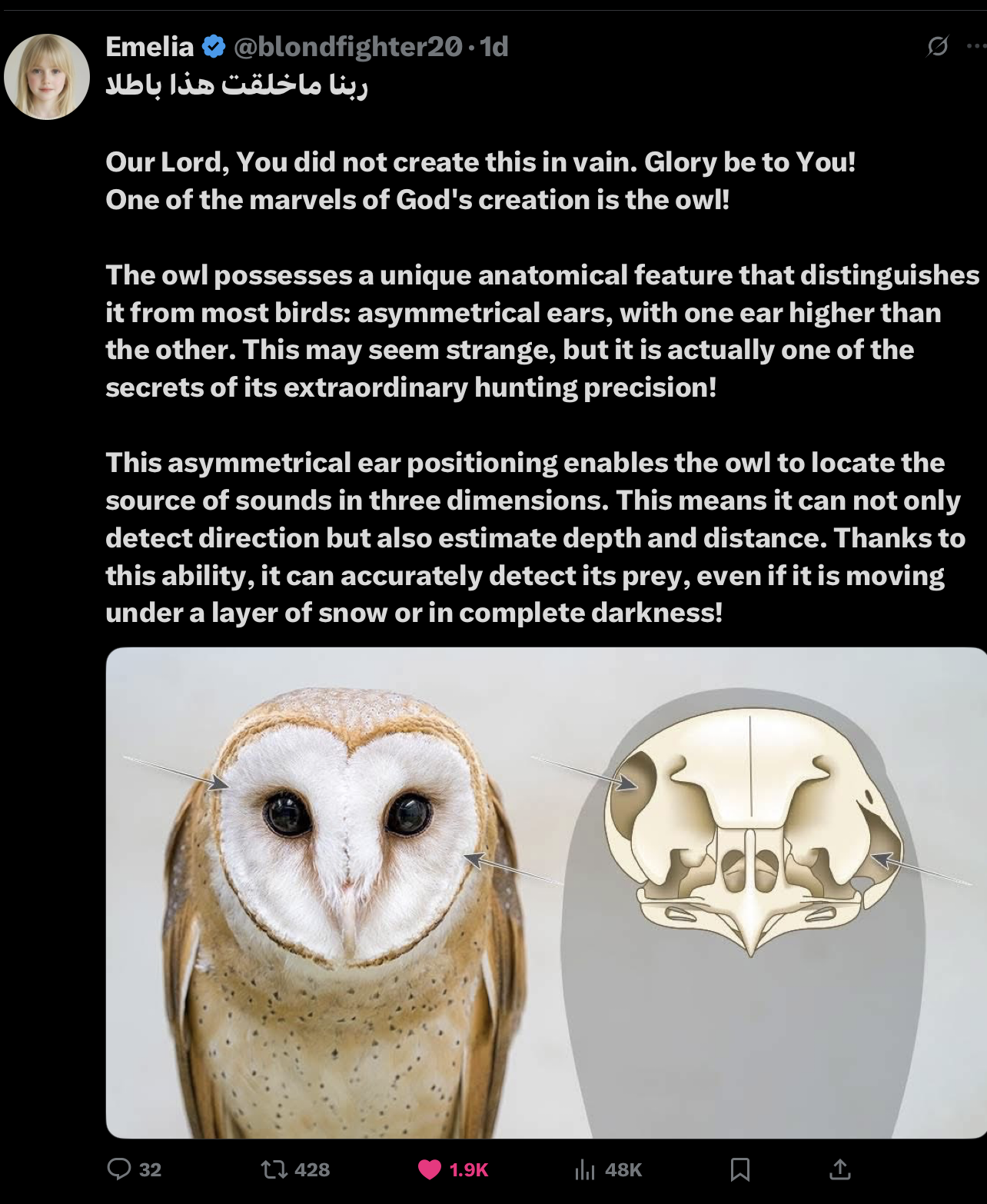 >>519814749>this asymmetrical ear positioning enables the owl to locate the source of sounds in three dimensionsDoes she think that other ears can't listen in three dimensions?