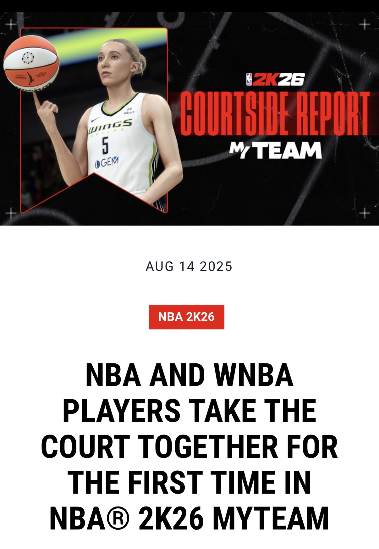 >Today, 2K announced the new features and improvements coming to MyTEAM in NBA® 2K26, including the addition of WNBA Player Cards for the first time in franchise history. In this milestone addition, players will be able to collect and play with current and historic WNBA players and pair them with their favorite NBA superstarsThis changes everything. We can finally know what would happen if Caitlin Clark went up against Michael Jordan and LeBron James 2v1. Spoiler alert: Caitlin wins. This will finally put the WNBA haters to rest when they beat every NBA team in the game!https://newsroom.2k.com/news/nba-and-wnba-players-take-the-court-together-for-the-first-time-in-nbar-2k26-myteam