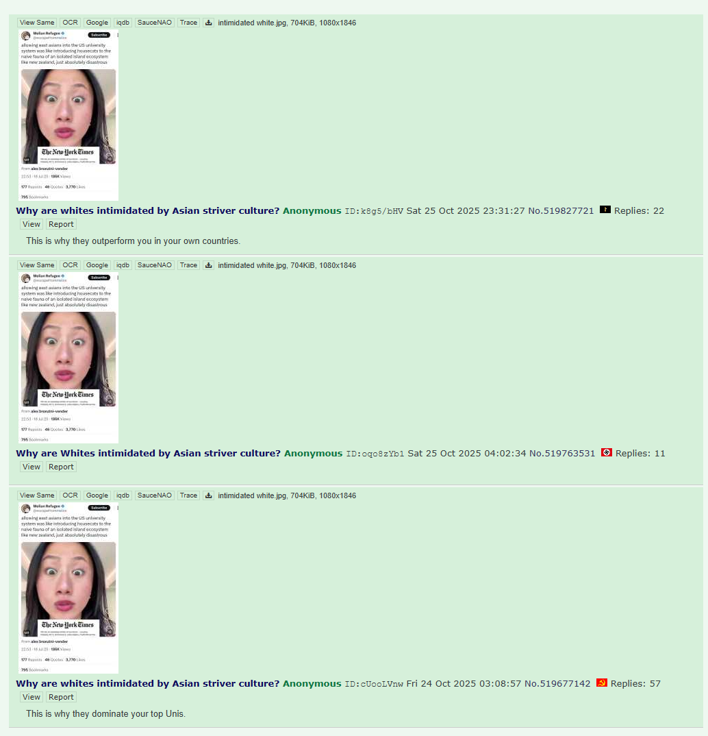 >>519827721>This is why they outperform you in your own countries.tell me you've never lived around gooks without telling me. they're no different than jeets you stupid fucker.at best, pedantic chuds who can't innovate, and need to flee to the west to be "successful". zero innovation comes out of the orient, they're just riding the coattails of europeans with their copy culture.even nips, the sacred cows of 4chins, are fundamentally no different than chinks: poorfags who ripped off the west, made dodgy shite, and are now stagnant/collapsing.
