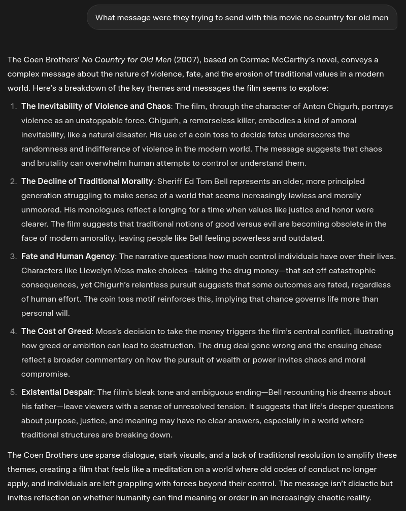 In a way No Country for Old Men is just an inversion of the archetypal heroes journey. The old sheriff can’t do it anymore and needs to retire. The good guy dies off screen and the hitman kills everyone he needs to, albeit almost getting killed at the end. The film rejects our notion that the good guy wins in the end, and instead suggests that things have always been violent, and the people trying to do good in the world get hurt the most when they involve themselves with the affairs of the underworld. I sort of think in some sense, writing stuff like this was edgy at first and shocking, but now it’s gotten a bit stale because it’s essentially just saying “the world is bad and it will never be good so stop saying it’s worse now when it has always been violent and evil.” Like, basically the whole point was that the world was evil and will be evil and is evil, and there’s nothing we can do to stop it. Just a blackpilled nihilistic perspective focused thru different characters in a “bad guy wins” story with western elements.