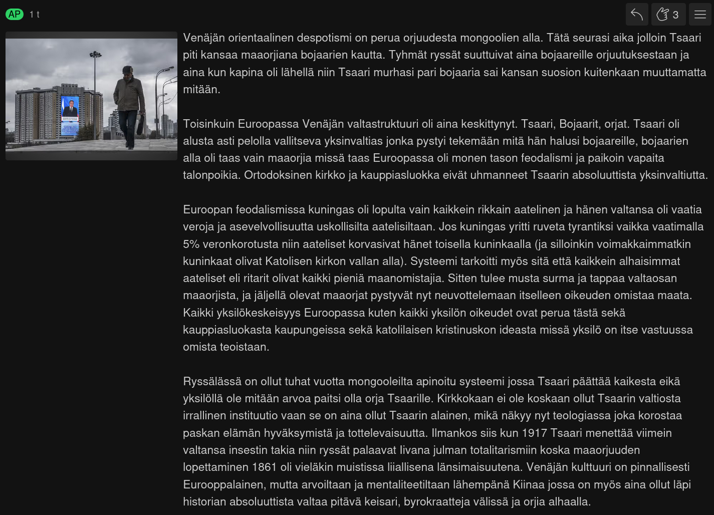 >>519842134Its goes further than Mongols.Russian stated was crated by conquering slav tribes by Vikings. They build towns on rivers and dont really interacted with local population. Except once year Viking Konung took his army out of town visited villages and collected tribute. Basically Viking raid only raided surrender by default.