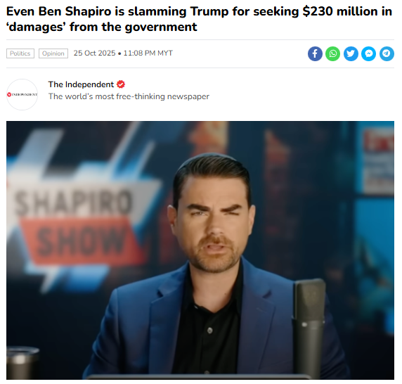 >>519852952>even ben shapiroso the guy who started the never trump movement, didn't vote for him, and only warmed up to him to steer him toward likud policies doesn't think trump should be compensated for his rights being violated? i'm shocked to hear it