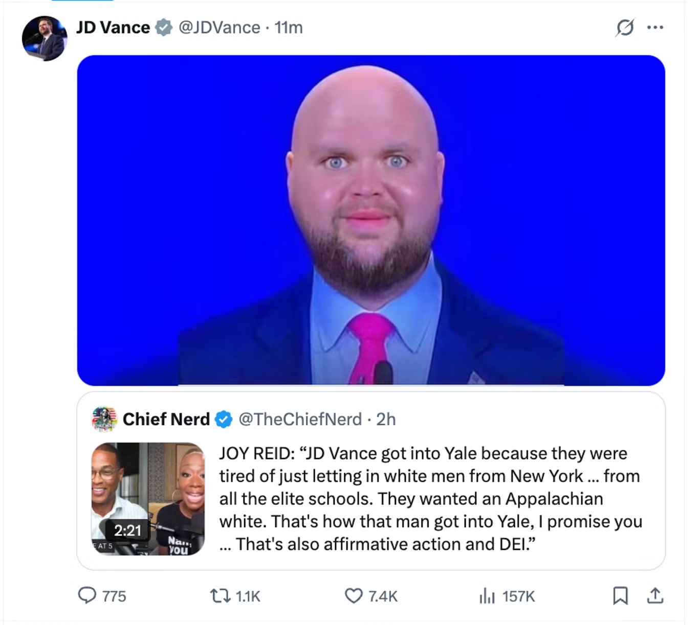 Let's talk about Vance's chances of winning the next election.He's adapted okay so far by leaning into the>I'm a bit of an assholeside of MAGA, but he's no Trump. Trump gets away with it by being funny and charismatic but JD mostly just comes across like a dick. He also falls apart from time to time and starts parroting talking points like a very typical politician (e.g. when questioned about the money Tom Homan took).The best thing he's got going for him is that Dems are a disaster and have terrible candidates. I could see him winning but going the way of Bush Sr. tb h.