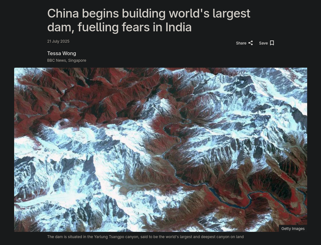 China already has the worlds biggest dam but now they are just making an even bigger one.>Upon completion, it will become the world's largest hydropower facility, with an anticipated annual power generation capacity of 300 billion kilowatt-hours—triple that of the Three Gorges DamThis dam alone could power an entire US state like California.Annual electricity consumption (approx., 2022–2023)California ~260 billion kWh