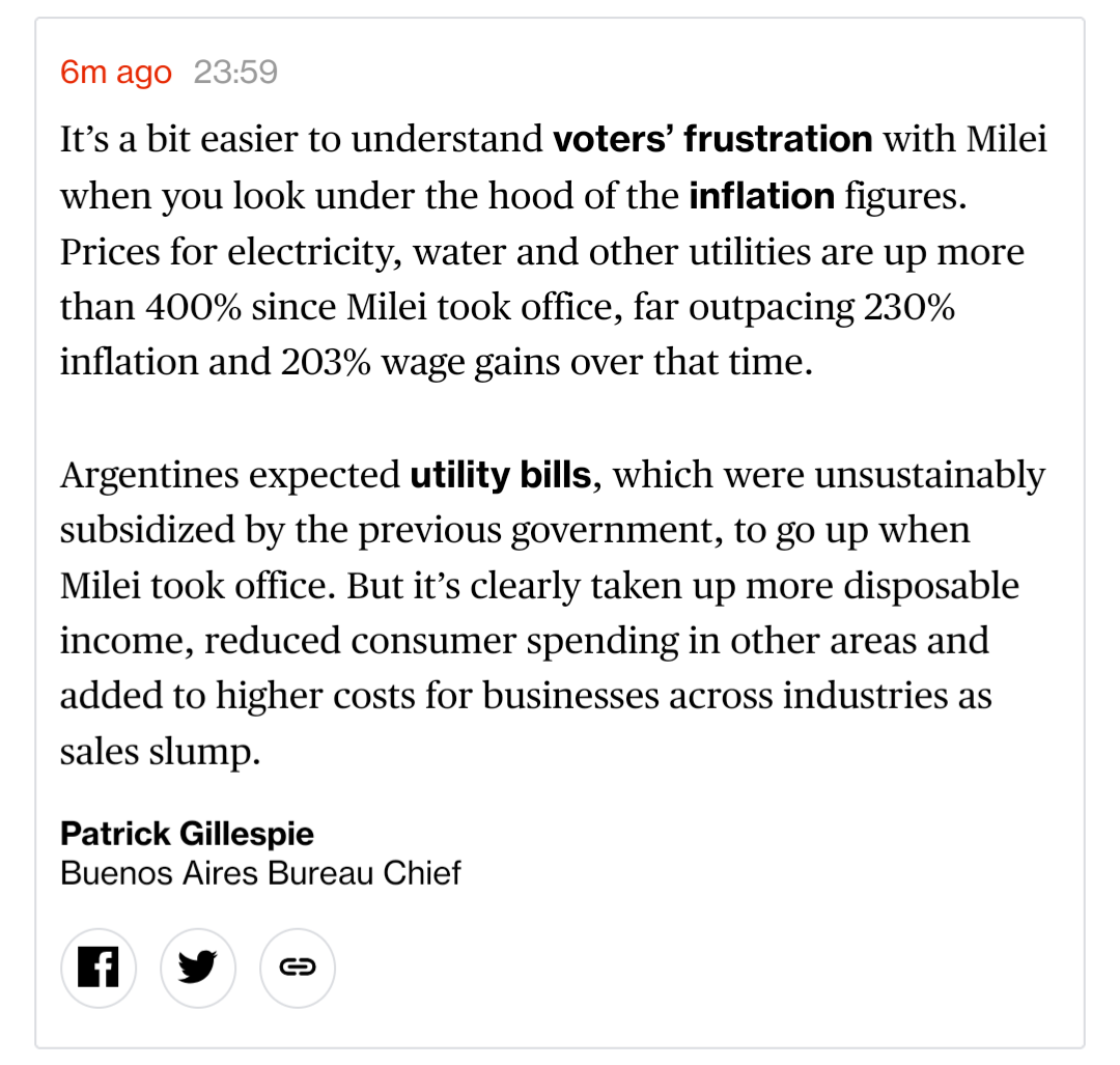 >>519896162More of the same. We already had something like him under Macri. Milei didn't managed to lower the inflation below the levels for Cristina Kirchner, the Peronist responsible of for the inflation mess and for the exchange controls. She had around 25% of annual inflation in her last goverment as President and Milei has around 31,8%. Milei removed part of the exchange controls, which is great, but prices are ridiculously high in dollars. We are paying more here for everything in dollars than my relatives living in Spain.