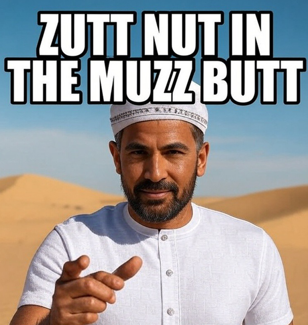 >I LIKE BIG ZUTTS >AND I CANNOT LIE>YOUR PROPHET CAN'T DENY>WHEN A ZUTT WALKS IN>WITH HIS BROWN SHIT SKIN>AND HIS BZC IN YOUR FACE>MOHAMMED GETS SPRUNG>GONNA MOUNT HIM UP>CUZ YOU KNOW MOHAMMED GETS STUFFED>DEEP IN THE DESERT HE SWEARIN'>AS HIS BUTTHOLE STARTS A-TEARIN'>OH ALLAH, ZUTTS GONNA HIT'CHA>CATCHER TO THEIR PITCHA'>HABIBI TRIED TO WARN ME>BUT THAT BIG ZUTT COCK MAKES ME SO HORNY