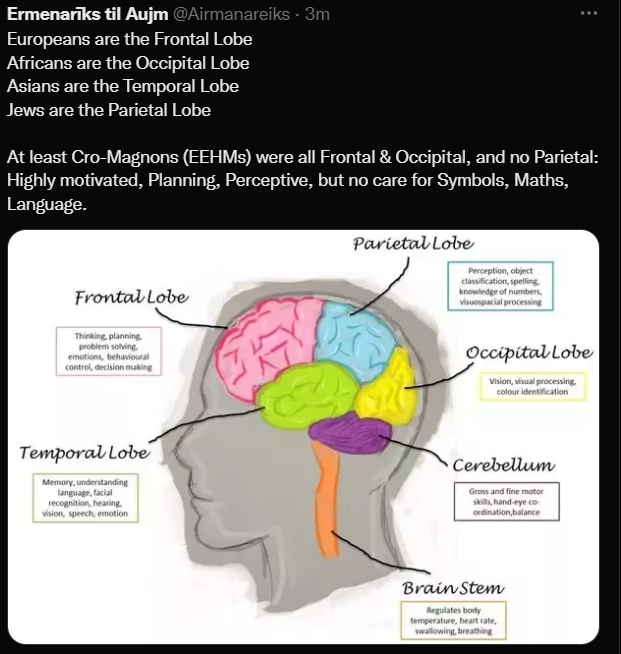 >>519949247>>519949826Meanwhile, the development of the parietal lobe (jewish part of the brain) determines verbal IQ, which gives a greater ability to lie, a tendency toward sociopathy... the word salad type... and belief in religion and abstract concepts without form or location, such as Yahweh.For example, people with high verbal IQ (parietal lobe) view the world in a more gray manner than people with a developed frontal lobe, failing to find inherent meaning in the world, abstracting themselves from reality into a Yahweh that cannot even exist (because it has neither form nor location, the minimum requirements for existence), an idol of letters. You have probably noticed this in yourself, a tendency toward urbanism rather than the countryside.