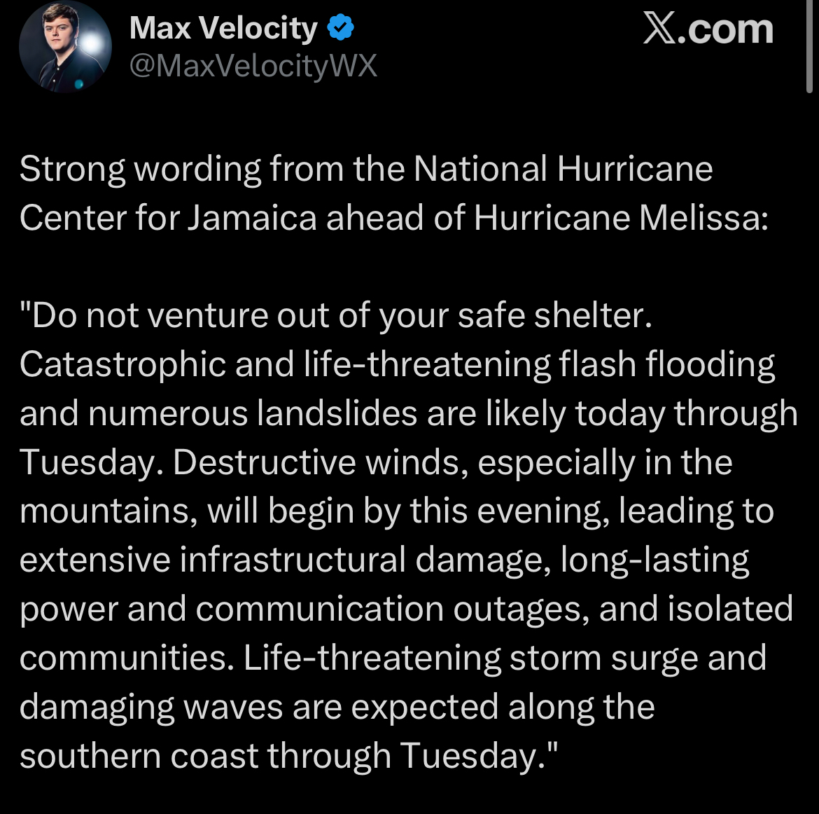 >>519941408It’s the strongest storm to ever hit Jamaica in the modern age of monitoring these storms. Just get your popcorn ready for some tnd and give Mellisa your energy