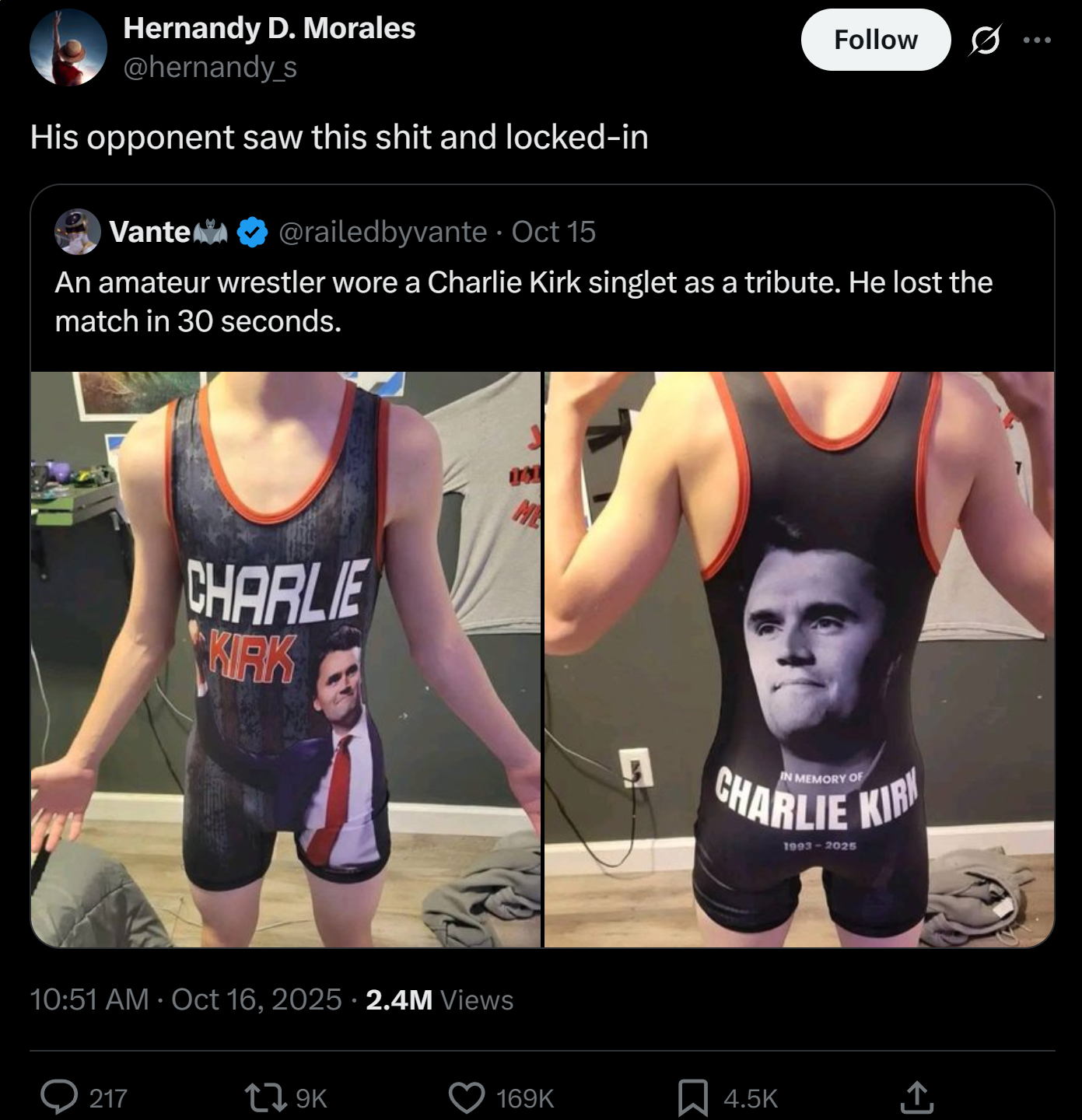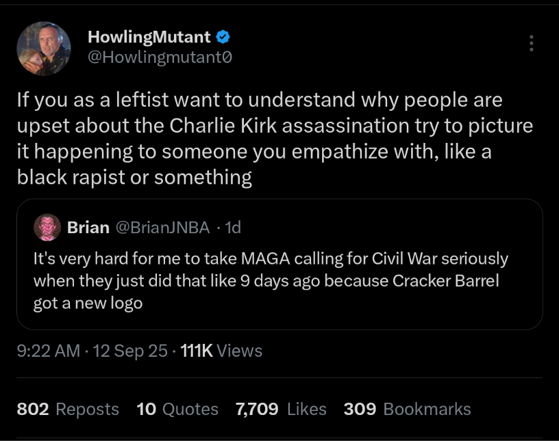 >>519948246>i know we went mask-off when someone we wanted killed as killed...>but, like, stop bringing it upSee >>519948248>>519948250Yes, the wage of "L takes" is clearly death, you said this when the man whose tweet you just posted was killed in front of a crowd of hundreds. I hope, for your own sake, that you're ready when someone tells you that your terms are acceptable.>>519948252>Charlie Kirk criticsOdd way to spell "ghouls celebrating a husband and father's death at the hands of one of the people he thought could be talked back into sanity."