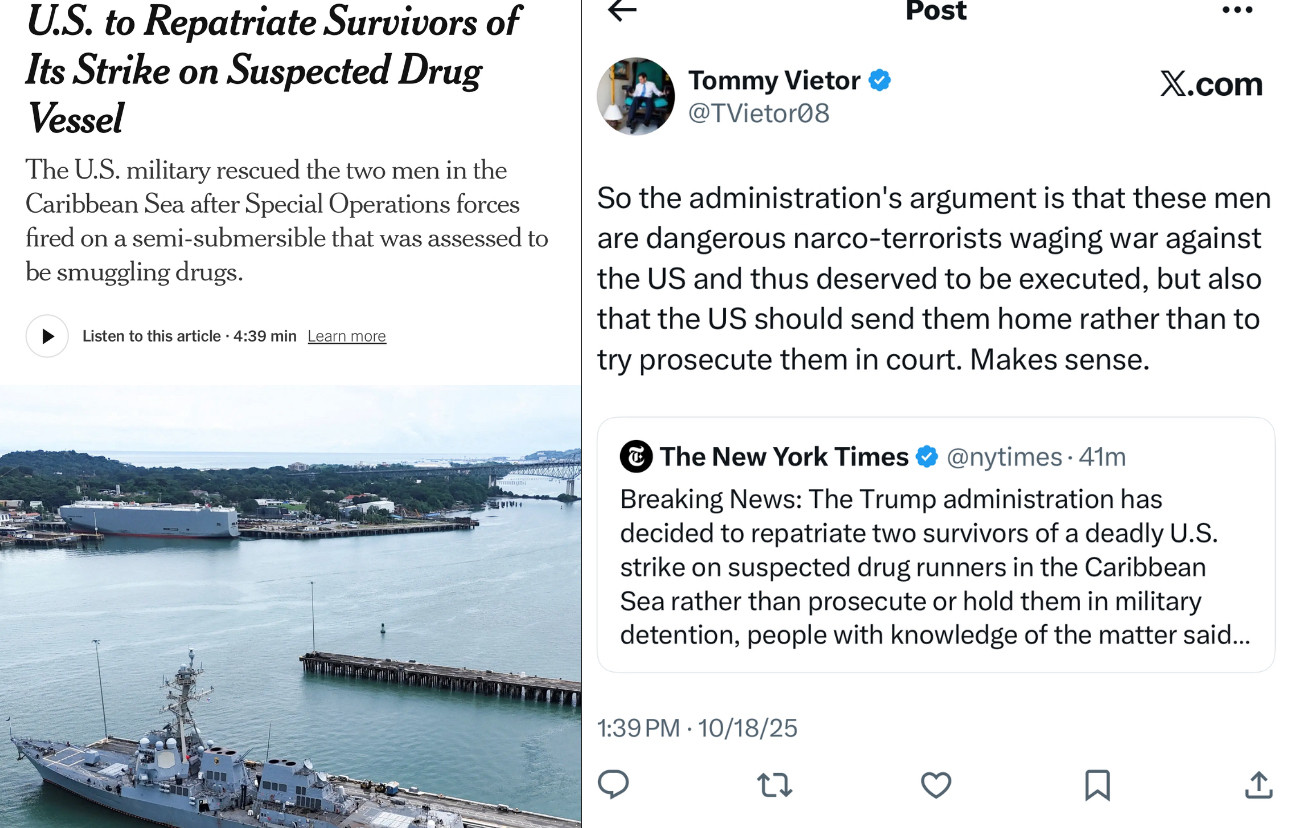 >>519948273Like how currently right wingers defend bombing boats because the government just says they were “drug dealers”. It goes entirely against international law, it ignores due process, and the boats are nowhere near US waters. But that doesn’t matter because they’re government said they’re “bad people” so that means they shouldn’t be arrested and tried, they absolutely have to be murdered by bombing them out of the sky. And at no point do we need evidence of them being drug traffickers.And when some of them survive? Well we’re going to deport them back because ummmmm… we can’t actually do a trial and execute them after finding them guilty in a court of law where you need… evidence of… guilt?