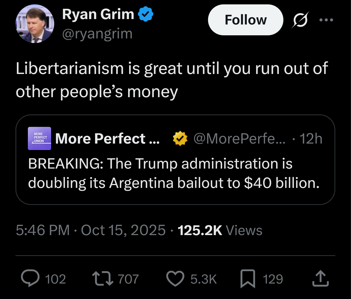 >Argentina slashes it's social programs, goes full lolbertarian and hands control to a dude that gifted Musk a chainsaw on camera>now their economy is up in flames, poverty exploded and they're asking for the US taxpayers to bail them outlibertarianism: not even once