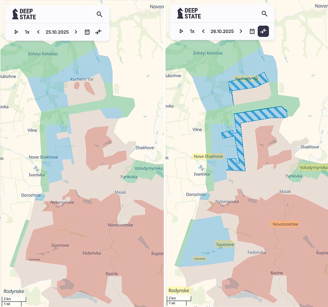 >In the Dobropillia direction, Ukrainian forces have continued mopping-up the northern part of the salient over the past few days. They have fully liberated the villages of Kucheriv Yar, Sukhetske and Zatyshok and have advanced near Nove Shakhove