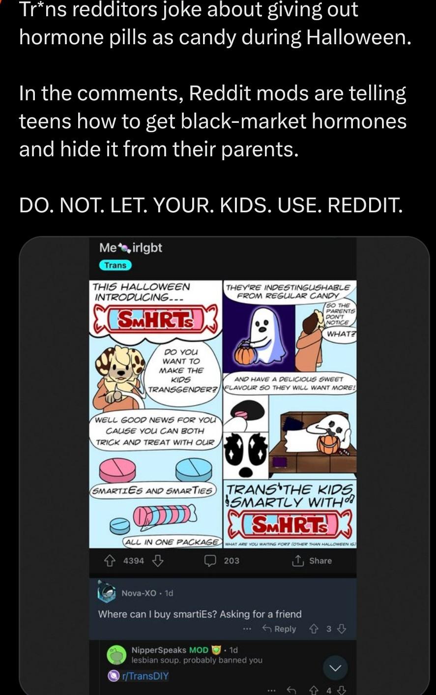 >>519979234>fairly certain>fairlyMaybe it is, maybe it’s not, but that you can’t tell with certainty betrays that everybody understands that this is something troons would conceivably do. If I heard a news story on Nov 1 that some troon was passing out hormones or hormone-laced candy the day prior, I wouldn’t be shocked, other than in this way (>>519979593)
