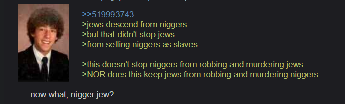 >>519993743>jews descend from niggers >but that didn't stop jews >from selling niggers as slaves>this doesn't stop niggers from robbing and murdering jews >NOR does this keep jews from robbing and murdering niggers now what, nigger jew?
