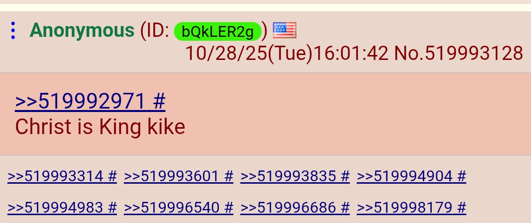 >>519992753Do not fall for glownigger divide & conquer tactics.Christianity is the definition of "right wing" political ideology:- https://en.wikipedia.org/wiki/Left%E2%80%93right_political_spectrum#Origins_in_the_French_RevolutionChristianity has always been a racist religion:>"Oh, race of Franks, race from across the mountains, race chosen and beloved [...]">"the kingdom of the Persians, an accursed race, a race utterly alienated from God [...]"- https://www2.cbn.com/article/church/pope-urban-iis-speech-calling-first-crusadeThe racist and anti-semitic Confederates have always been Christian.The National Socialists used the Celtic cross and gave out iron cross medals for bravery. The white term for "swastika" is hakenkreuz, meaning hooked cross.- https://en.wikipedia.org/wiki/HakenkreuzbannerHere's a growing list of Christian political commentators who are racist and anti-semitic:- https://rentry.org/Deus_VultFeel free to reply to this post with others.Educate boomers irl. If you don't preach to them, the anti-Christian kikes will:- https://news.antiwar.com/2025/10/06/israel-to-spend-up-to-4-1-million-in-propaganda-campaign-targeting-american-christians/israeli nationalism ("zionism") is a heresy:- https://youtu.be/GKlT-hhZXoM&t=658s- https://youtu.be/odNoExd8a5U- https://youtu.be/rp92-3aBL-AThe "holocaust" (burnt offering) is a lie made up by kikes, both soviet and freemason:- https://rumble.com/c/ScriptureandTraditionFrJM/videosBoycott israeli products:- https://bdsmovement.netCommon glownigger talking points:>"jesus is a kike"The word "kike" comes from "kikel", which means circle. The kikes hate the cross so much, they would sign documents with a circle, hence the nickname.- https://en.wikipedia.org/wiki/Plus_and_minus_signs#Alternative_plus_sign>"off topic"Reminder the pope is the monarch of a country. In fact in many white nations there is no separation between church and state.