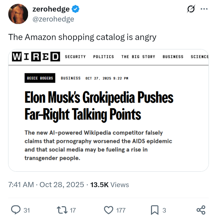 >>520014844I was seeing a few of them last night. Very white-pilling. As I said then, of all the destruction of internet institutions, I felt Wikipedia the most. It was great in its early days. But the position that Grok is positioning itself is actually incredible. It is the place were you go if you want to know what is true. What is truth. So, what is the point of a lot of universities anymore? This could be a modern day "dissolution of the monasteries". Incredible, if you think of it.