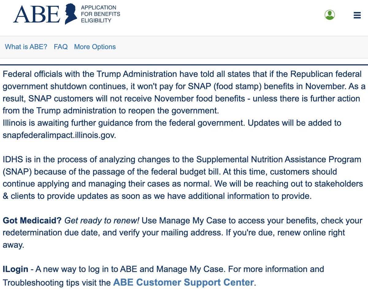 Illinois’ benefits website now displays a message warning that “federal officials with the Trump administration have told all states that if the Republican-led federal government shutdown continues, it won't pay for SNAP (food stamp) benefits in November. As a result, SNAP customers will not receive November food benefits - unless there is further action from the Trump administration to reopen the government."